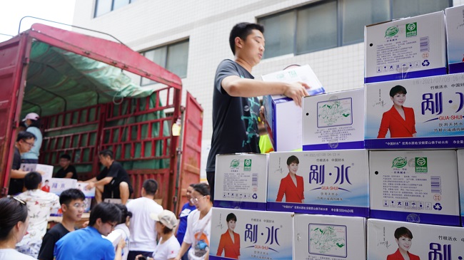 7月24日,大别山野岭饮料联合迎驾慈善基金会捐赠24万瓶剐水驰援河南暴雨受灾地。让受灾群众安全饮水有保障,让救援人员饮水充足有力量。
